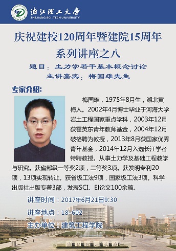 梅国雄,1975年8月生,湖北黄梅人。2002年4月博士毕业于河海大学岩土工程国家重点学科,2003年12月获霍英东青年教师基金,2004年12月破格聘为教授,2013年8月获国家优秀青年基金,2014年12月入选长江学者特聘教授。从事土力学及基础工程教学与研究。获省部级一等奖2项,二等奖3项。获发明专利20项,13项实现转让。获省级工法9项,国家级工法3项。科学出版社出版专著3部,发表SCI、EI论文100余篇。