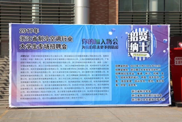 2017年11月11日上午,浙江理工大学下沙校区学生活动中心二楼开展了浙江省制冷空调行业大学生专场招聘。此次招聘会由浙江省制冷学会和浙江省制冷空调行业协会主办,浙江省制冷学会学生工作委员会、浙江理工大学承办,主要针对制冷空调行业大学生展开招聘。招聘会到场40余家用人单位,招聘岗位及专业有暖通、制冷、机械、电气、给排水等的设计、研发、技术支持、销售、项目管理、培训专员、质检、售后服务、外贸、文员等,吸引我校与其他高校众多对口专业大三大四学生前来。